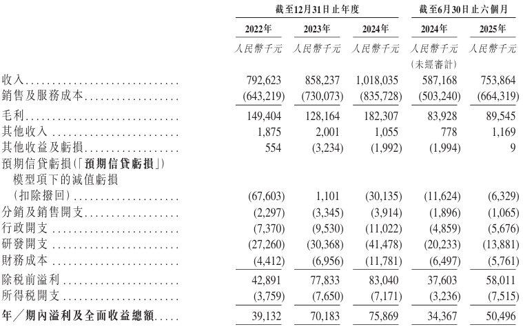业绩方面,2022年、2023年、2024年及2025年截至6月30日止六个月,该公司实现收入分别约为7.93亿元、8.58亿元、10.18亿元、7.54亿元人民币;同期,年╱期内溢利及全面收益总额约为3913.2万元、7018.3万元、7586.9万元、5049.6万元人民币。