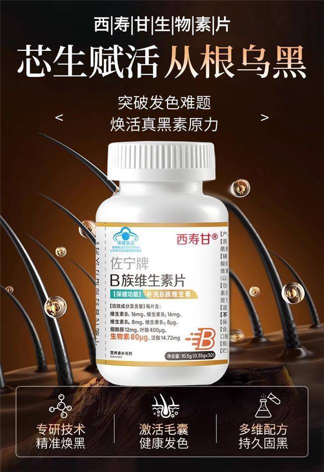 维生素B1、B2促进能量转化,确保头皮细胞获得足够动力;维生素B6、烟酰胺平衡头皮油脂,避免因油脂堆积导致的毛囊堵塞;叶酸与维生素B12则改善头皮微循环,让营养物质更高效地输送至毛囊。 在促进黑色素生成方面,生物素可激活酪氨酸酶的活性,而酪氨酸酶是黑色素合成的关键酶。黑色素是决定头发颜色的核心物质,其含量不足会导致头发变白。通过增强酪氨酸酶活性,西寿甘黑发生物素片有助于提升毛囊中黑色素的生成量,使新生头发呈现自然乌黑的色泽。