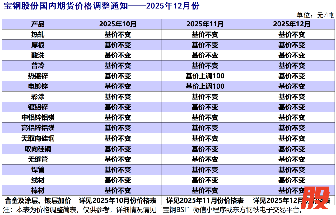 经研究决定,宝钢股份内销价格2025年12月份在11月份基础上调整公告如下(以下除特殊注明外,均为不含税):